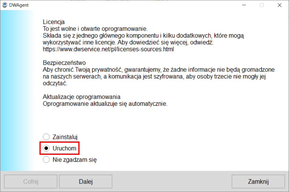 Uruchom pobrany plik.W oknie instalatora wybierz opcję "Uruchom", a następnie kliknij przycisk "Dalej".