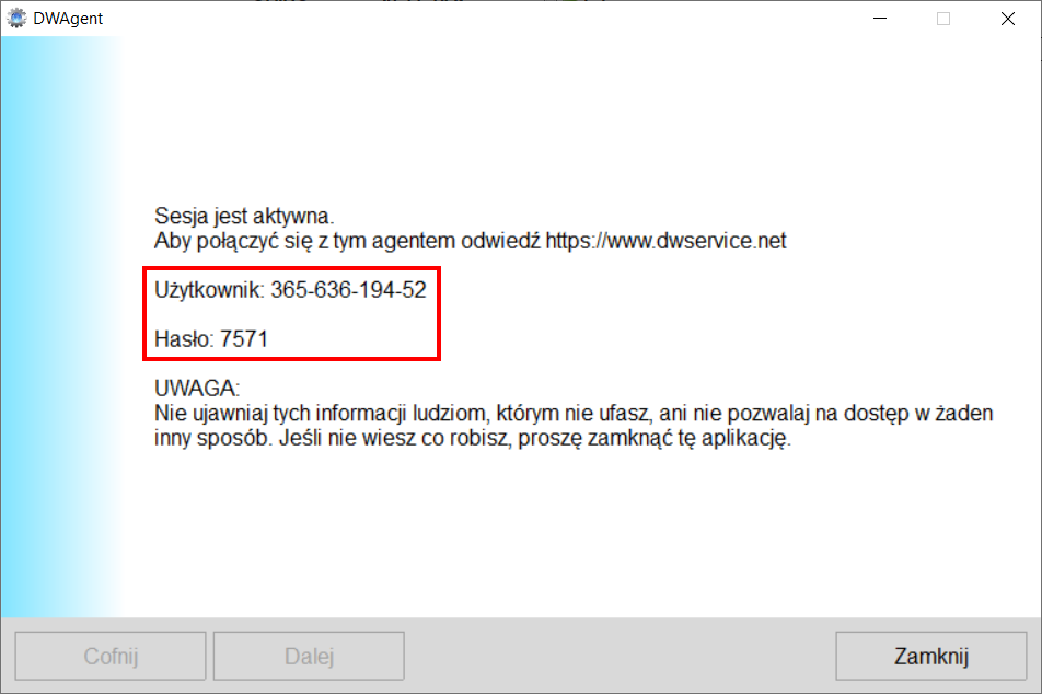 Zamknięcie ostatniego okna instalatora kończy sesję połączenia zdalnego.